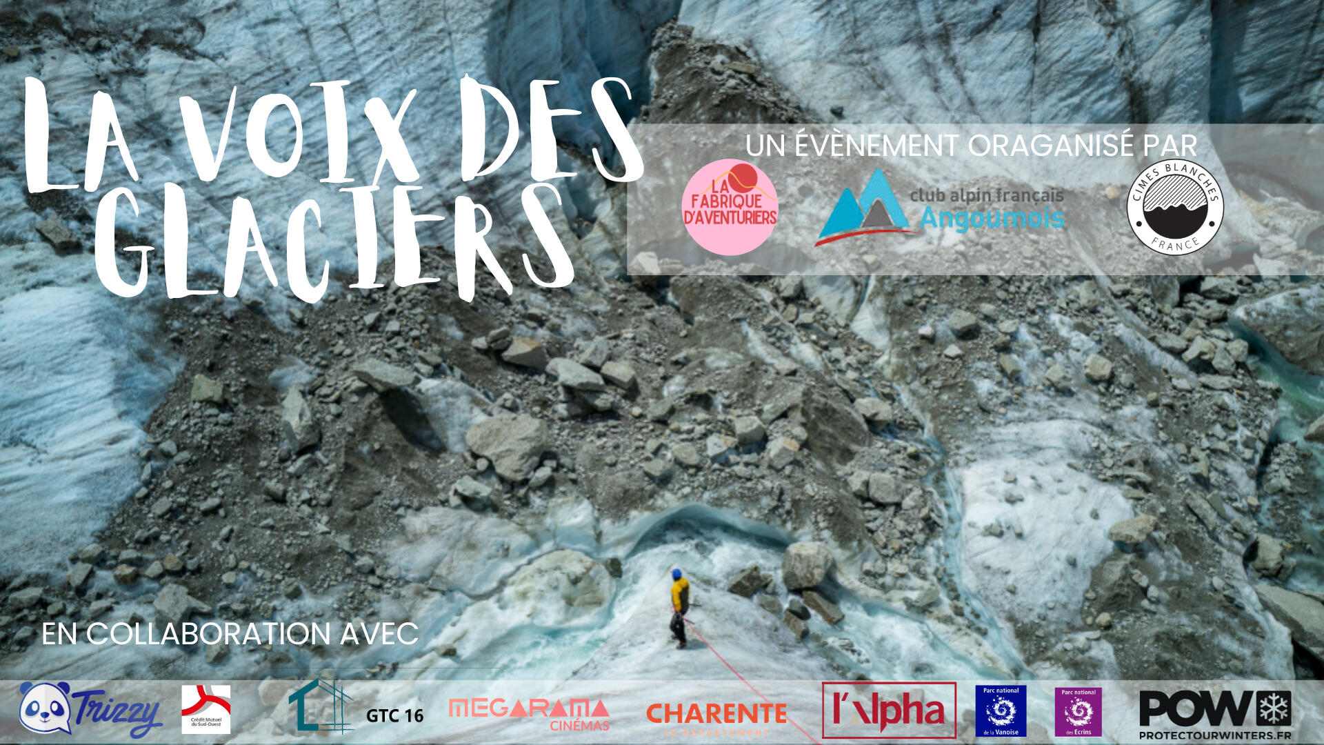 Jeudi 19 Mars, à partir de 19h30, nous sommes très fiers d'organiser la 1ère édition de La Voix des Glaciers au cinéma Megarama de Garat. Cette soirée a été imaginée par La Fabrique d’Aventuriers et le Club Alpin Français Angoumois.
